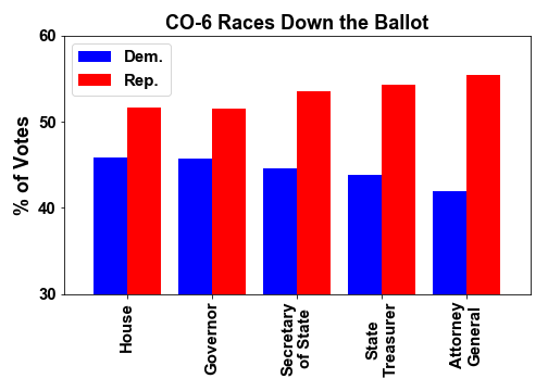 So what happened to Douglas County voters? Why the sudden purple hue? Races further down the ballot give us some insight into why the citizens of Douglas County voted the way they did, and we see that these results don’t quite fit the “blue wave” narrative that everyone is so fond of using. Across the board, Democrats did get a bump compared to previous years because of all the factors listed above, but some of that advantage disappears down the ballot. The higher profile races with national implications, i.e. the House and Governor’s races, only had a Republican edge of 5.9% while the race for Attorney General ballooned up to 13.5%. This could suggest that voters wanted to rebuke the White House while keeping local government conservative.