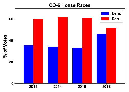 As results came pouring in, this prediction turned out to be an understatement. Jason Crow went on to take thirteen precincts in Douglas County and only lost the county by six percentage points. Losing in any fashion may not sound like an uplifting fact, but the 22.0% jump from losing by 27.9% in 2016 to only 5.9% in 2018 is the largest gain out of all the counties in the district (Adams: 16.4%, Arapahoe: 19.8%).